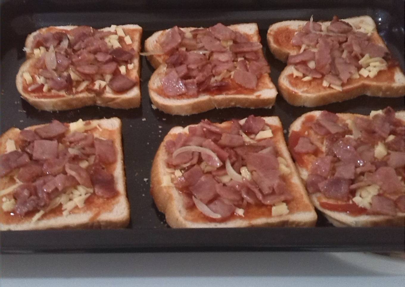 - Arrange the bread in an oven pan, spread tomato sauce then spread gratwd cheese.