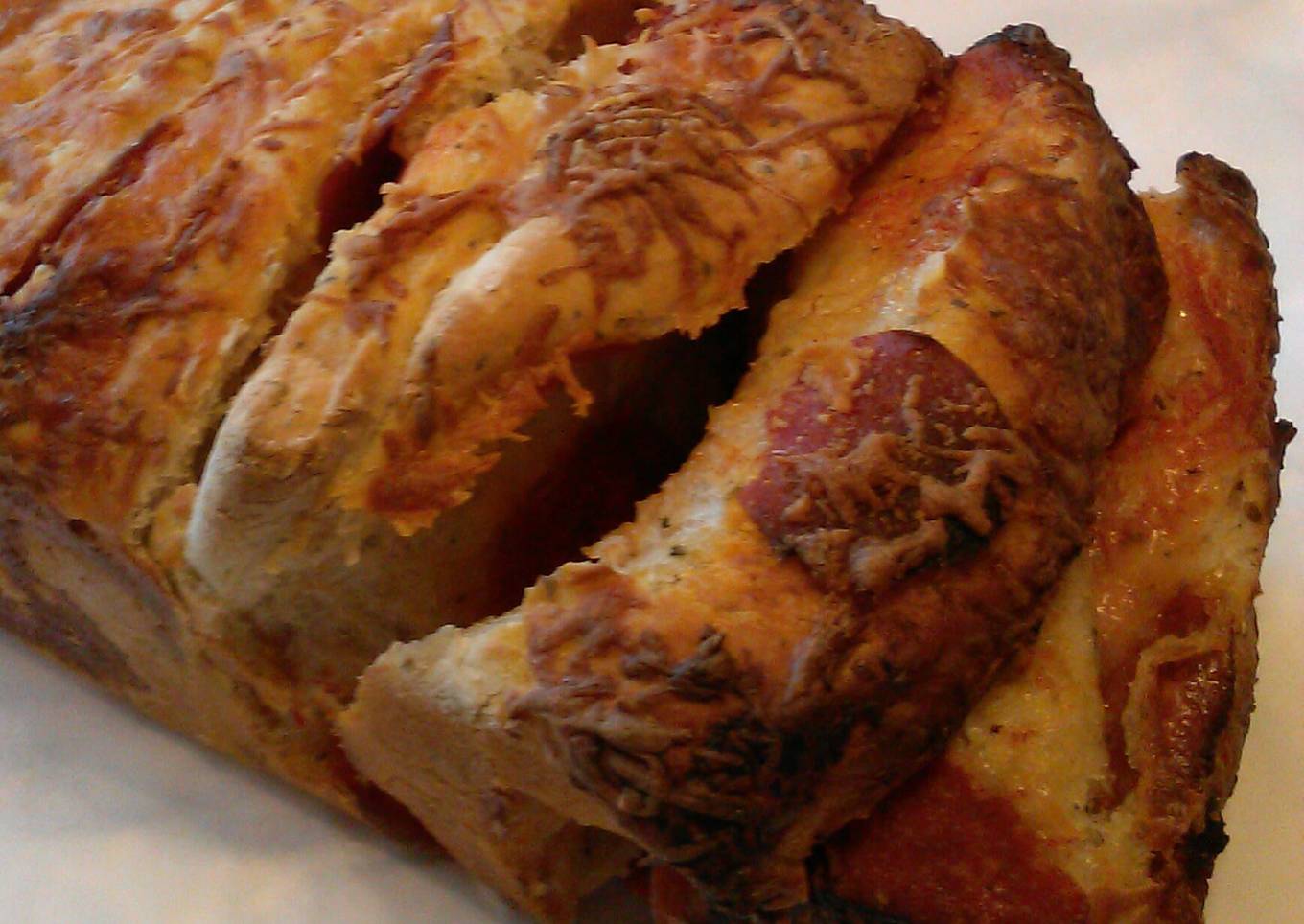- On lightly floured surface. Roll dough into an 18x12" retangle. Brush sause over dough. Sprinkle with cheese and top with pepperoni. Cut retangle into 5 equal strips . Stack strips one on top of the other. Then cut into 4 " squares.