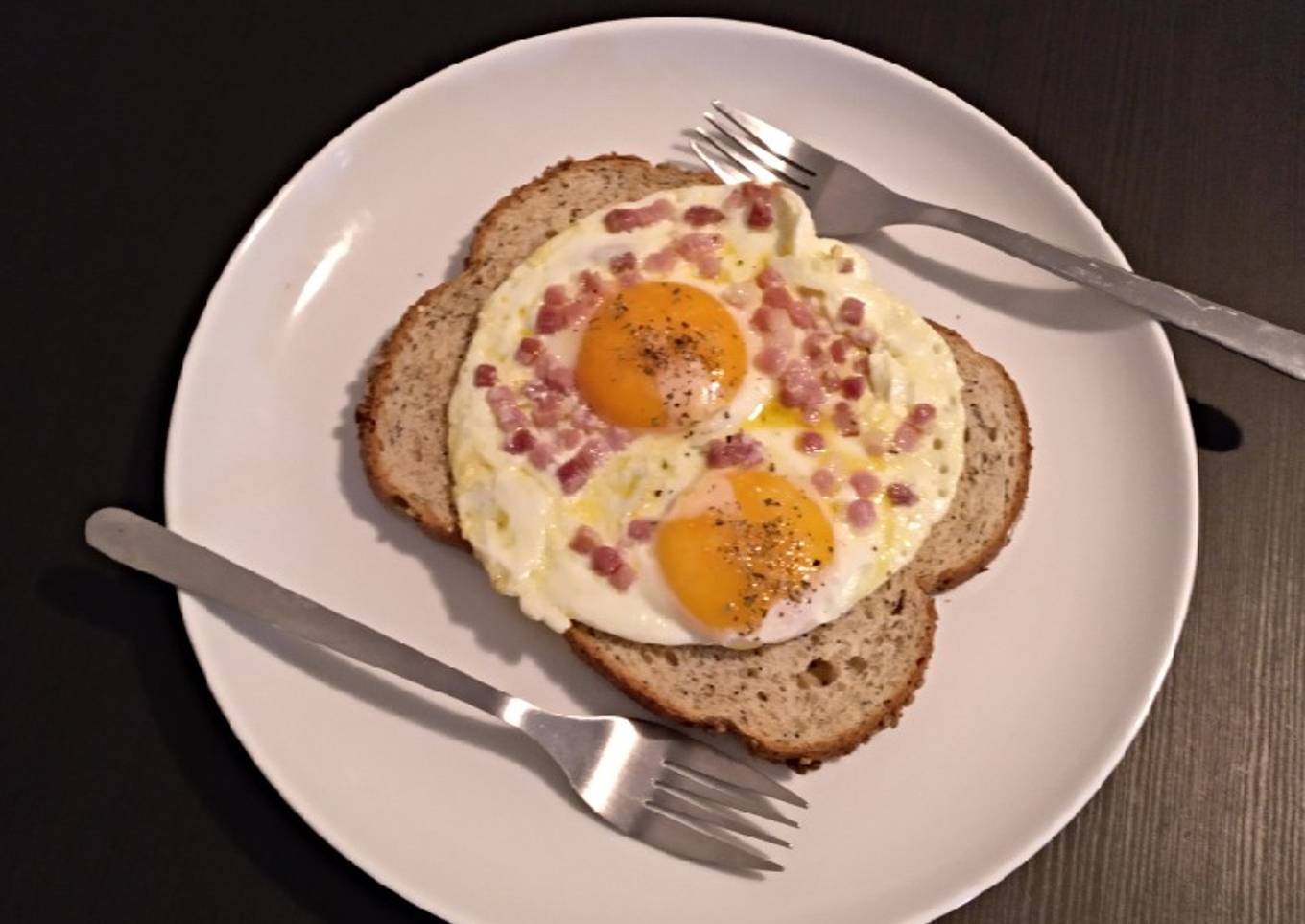 - Fry the eggs together with as less oil as possible and add the ham before It turns white to make It stick to the egg.