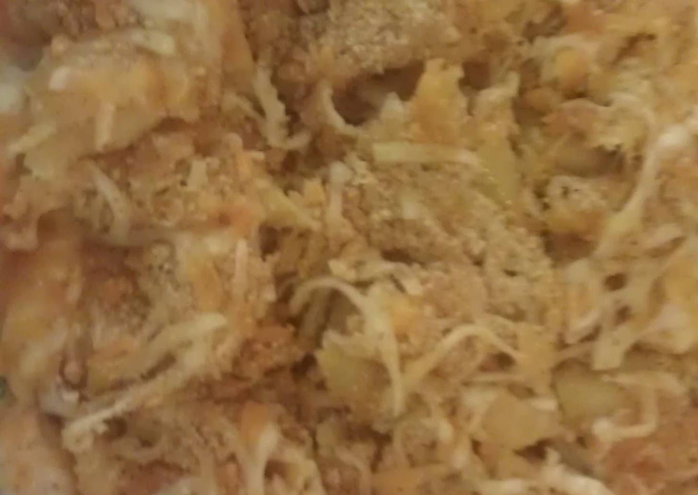 - And you put done some of the pasta then the cheese and the next layer of pasta and the cheese and the bread crums and your all done enjoy .