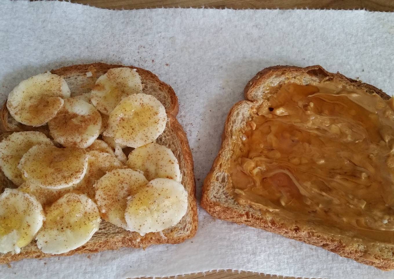 - Slightly toast bread. Spread peanut butter on two slices of bread and drizzle on half of the honey.