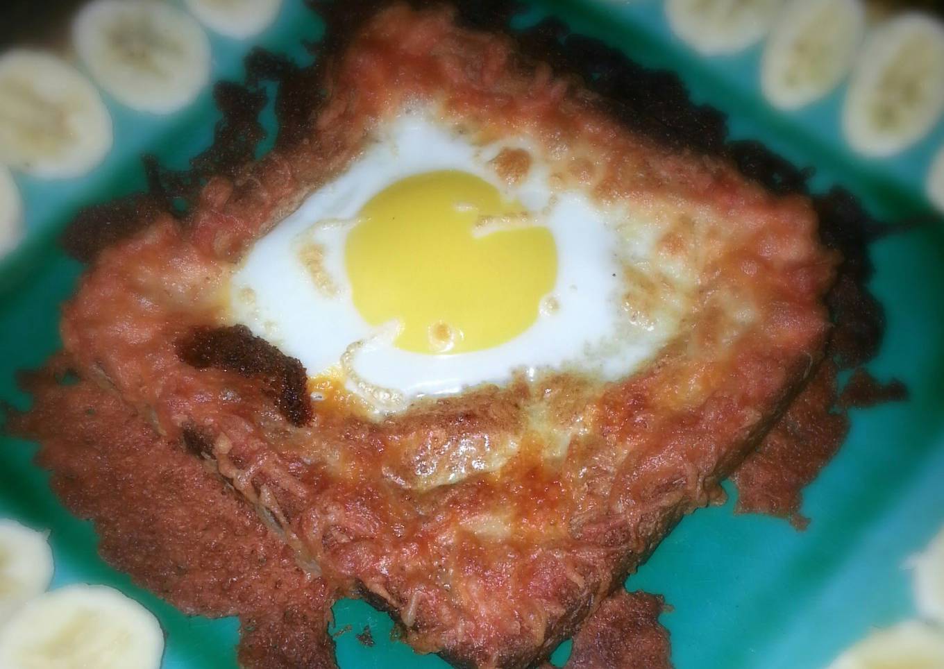- Crack open the egg and place it in the center of the bread.